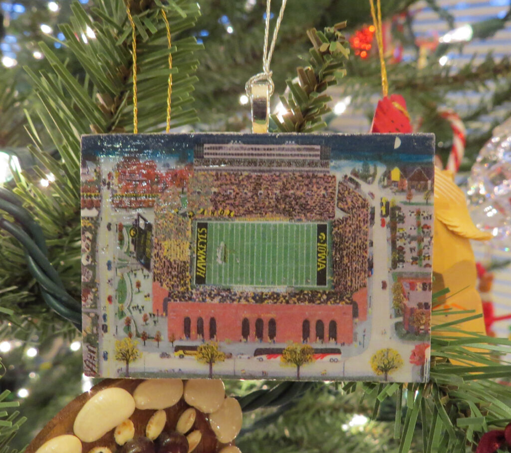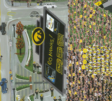 This painting of Kinnick Stadium is of the famous night game on Nov. 8, 2008 when the Hawkeyes and Coach Ferentz had a last second win over the Nittany Lions, lead by Coach Joe Paterno.