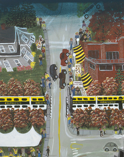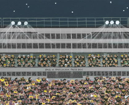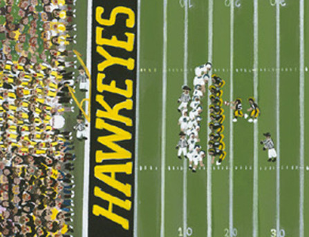 Included in this painting: the new Paul W. Brechler press box, “the kick” from the 21 yard line by Daniel Murray (#1) in the last second of the game, ball holder Ryan Donahue (#5), the Hawkeye fans were a “black out crowd” while the students have a “green out” to show support for Shonn Greene for the Heisman Trophy bid, the new turf (which was not installed until the following summer, but is included because it is so vivid and beautiful). Bump Elliott is in the press box.